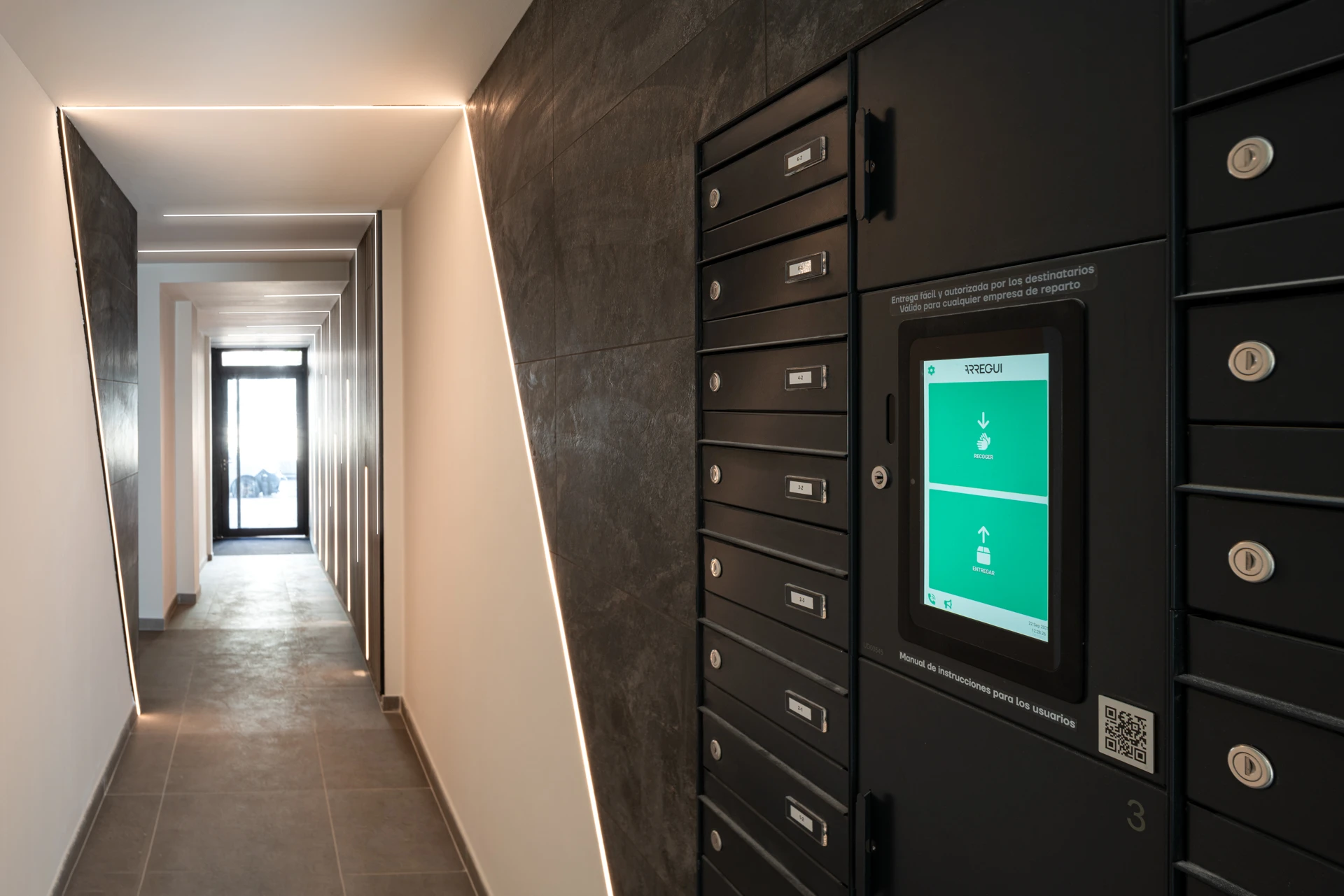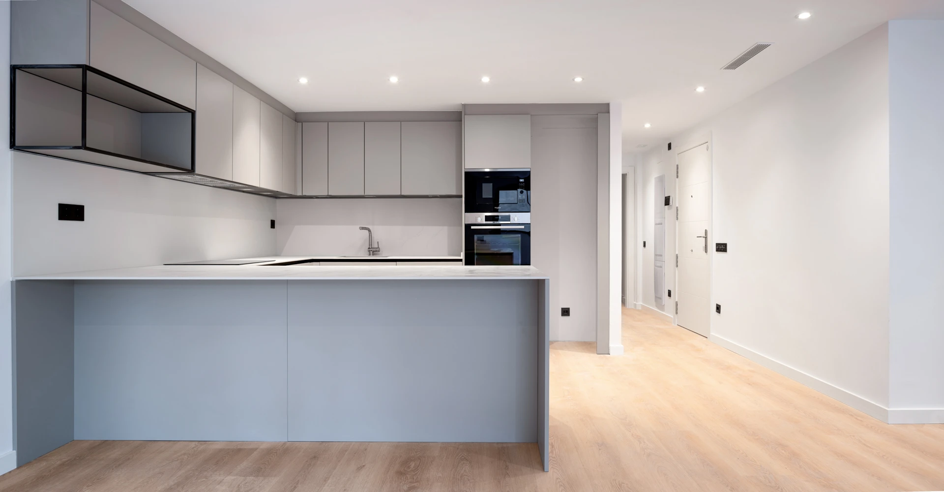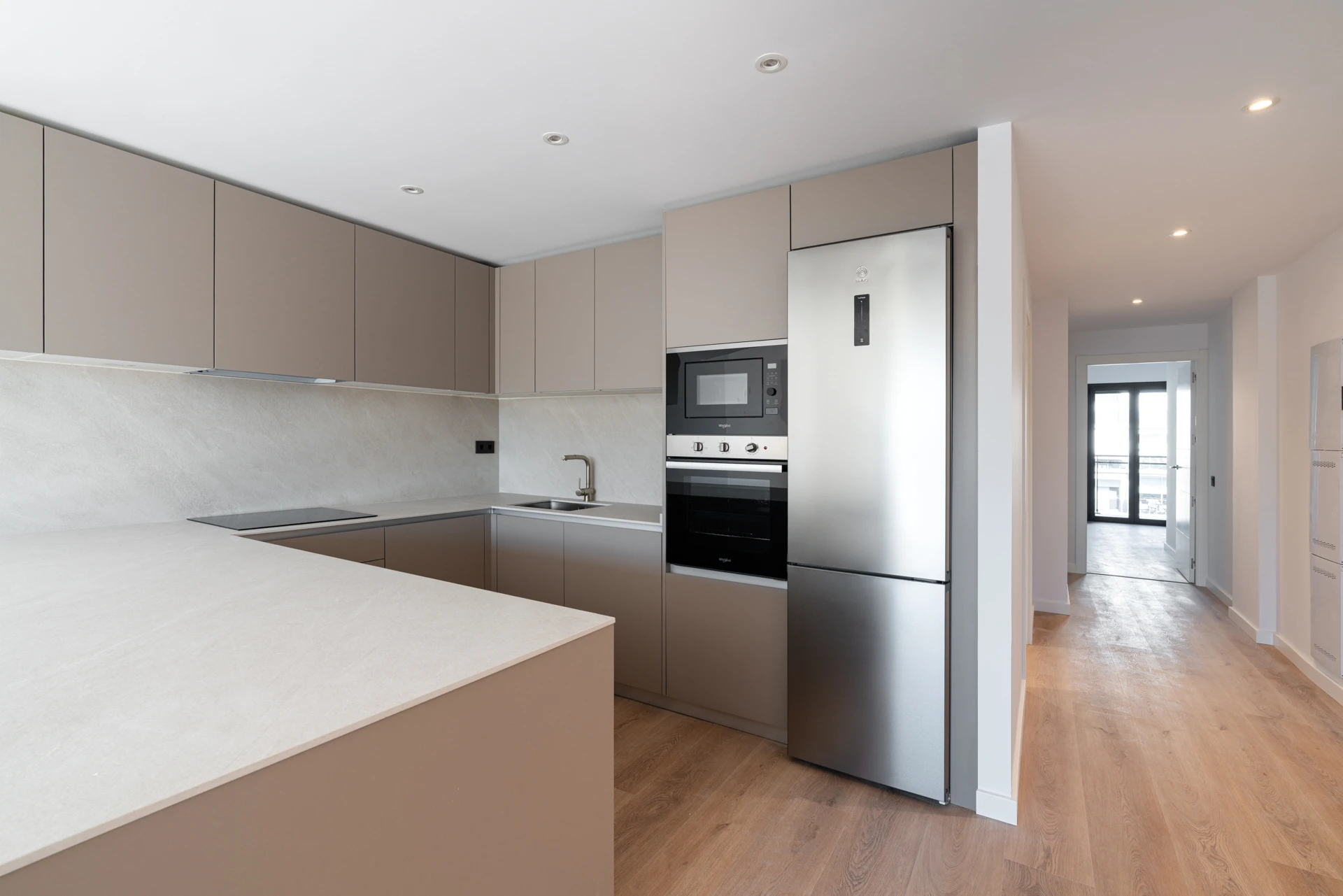 El edificio presenta una volumetría limpia y moderna, con amplios ventanales que maximizan la entrada de luz natural y conectan cada vivienda con el entorno urbano. En el interior, destacan los acabados premium, como la madera natural, las texturas pétreas y los detalles en negro mate, que aportan una estética sobria y contemporánea.