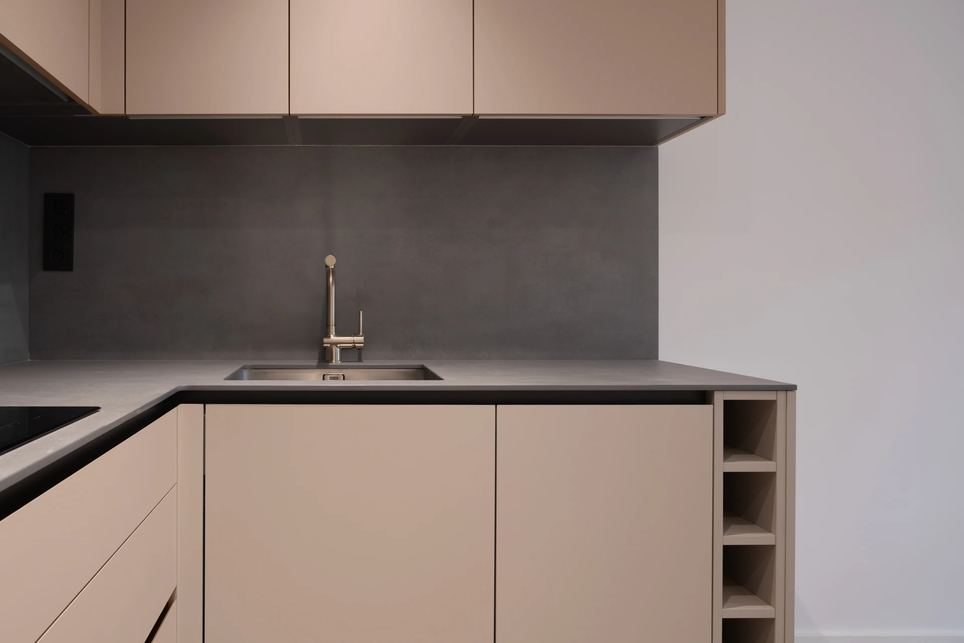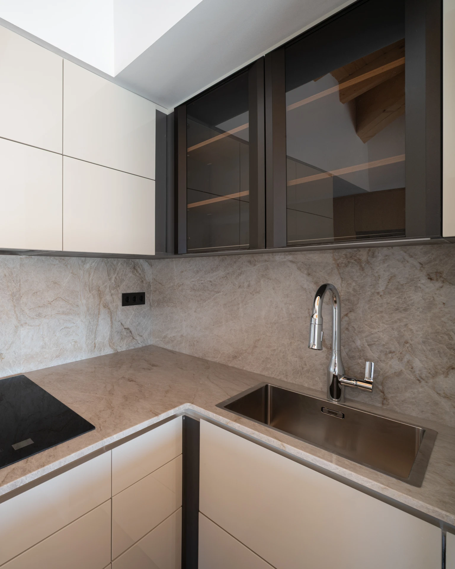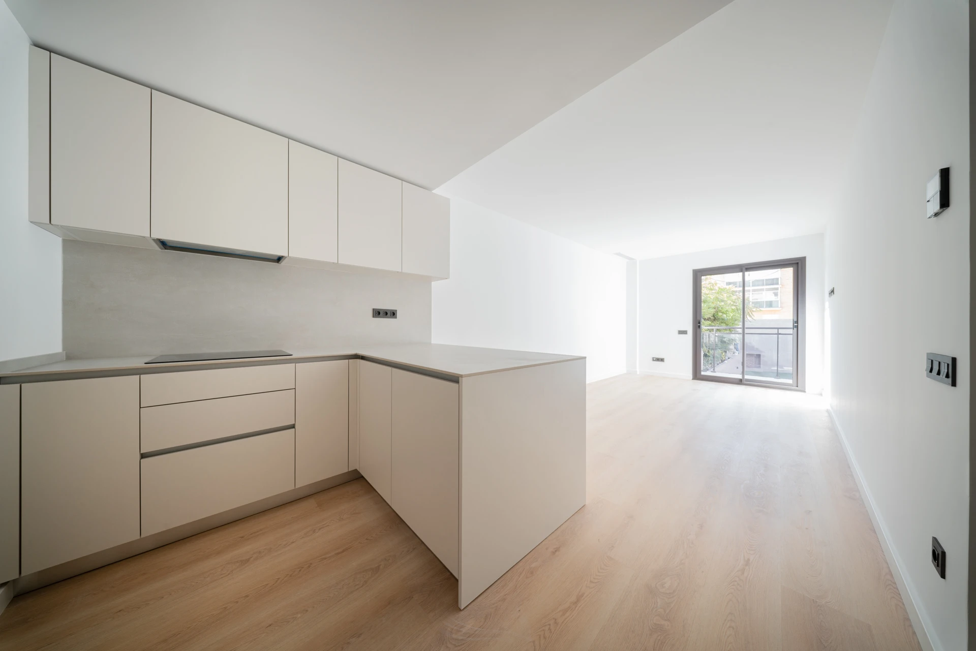 El edificio presenta una volumetría limpia y moderna, con amplios ventanales que maximizan la entrada de luz natural y conectan cada vivienda con el entorno urbano. En el interior, destacan los acabados premium, como la madera natural, las texturas pétreas y los detalles en negro mate, que aportan una estética sobria y contemporánea.